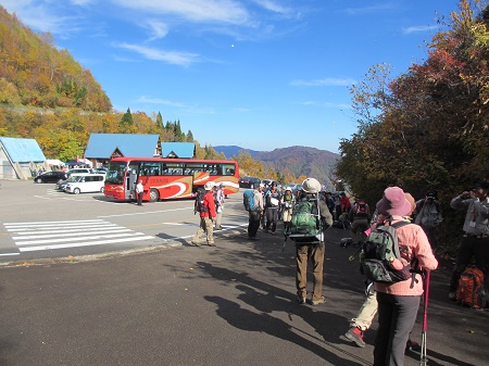 蓮如茶屋駐車場から出発です、赤いバスに乗って来ました。