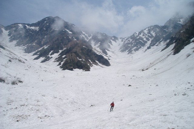 一部ガスが掛かり出すが、360度の展望を堪能し滑降へ。 山頂とコルの中間で、少し遅れていた西澤さんと合流。コルまで滑り降り、いよいよ猫又谷の大滑降。雪は適度に緩んでおり急斜面を我々だけの貸し切りで、大いにシーズンラストの滑りを堪能できました。堰堤からは、又